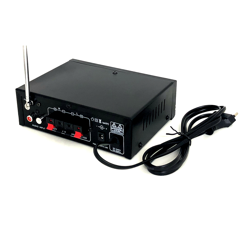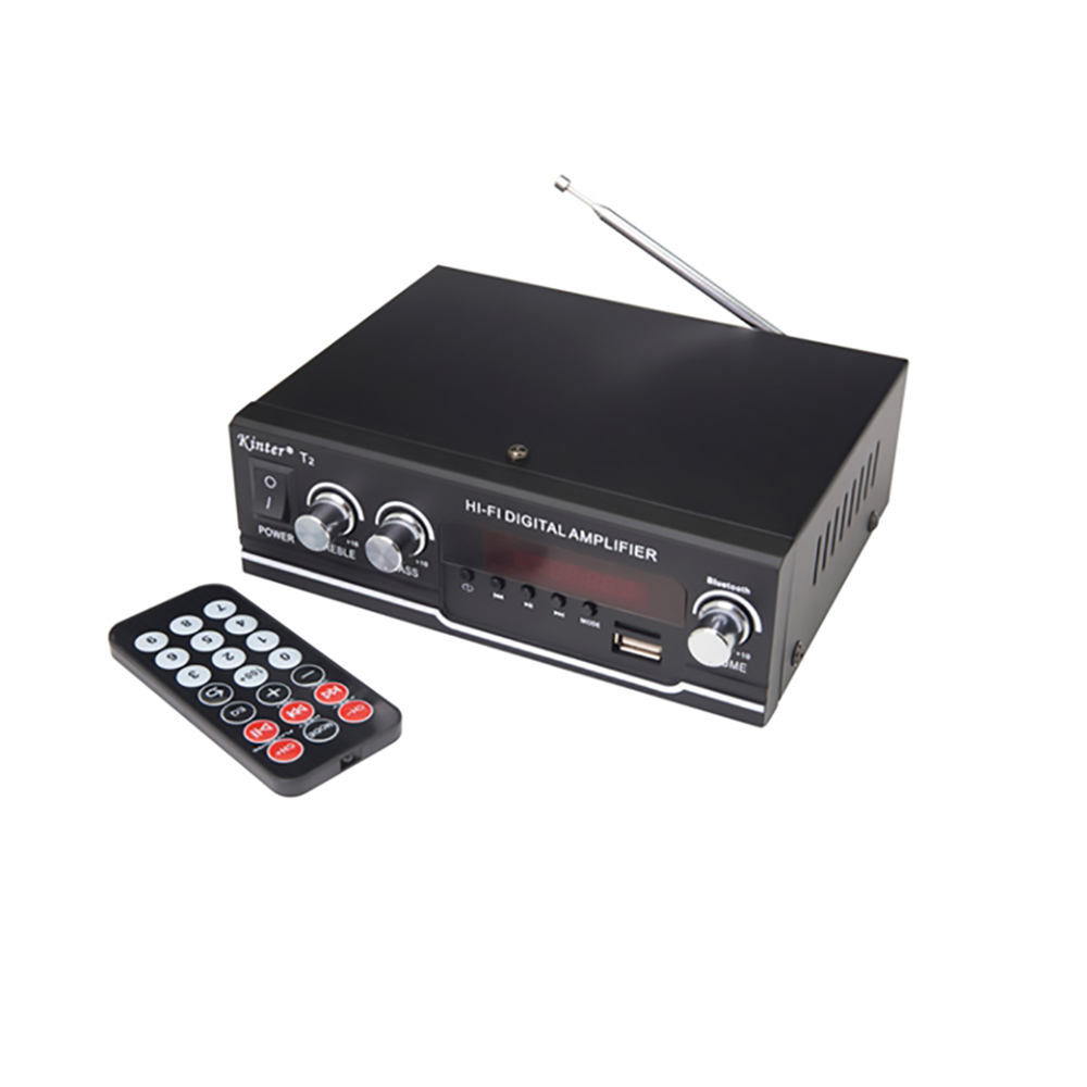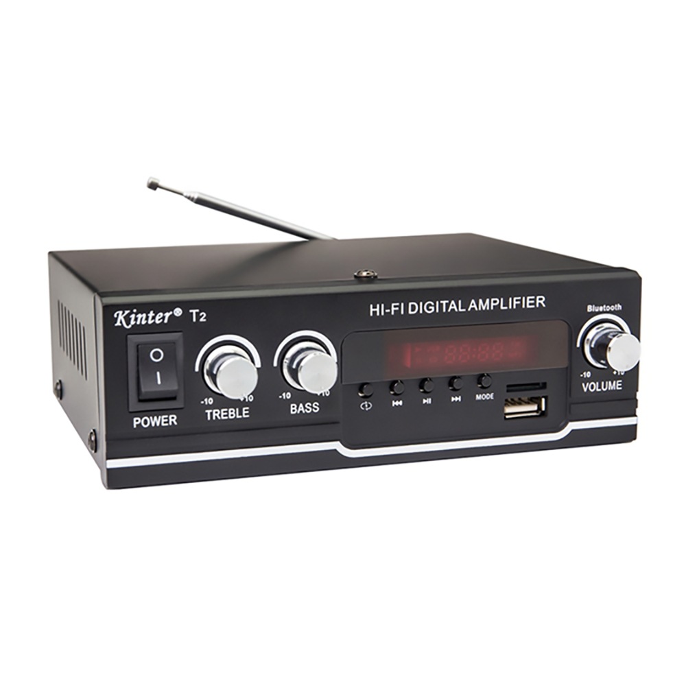 Аудио Bluetooth усилитель мощности Kinter T2 для дома и автомобиля обеспечивает качественное звучание на высоких и низких частотах на любой громкости. Усилитель мощности звука подойдет для авто, для ноутбука, для компьютера, для колонок домашней стерео системы, для наушников. Домашний усилитель оснащен портом USB, через который подключается к устройствам и получает питание от 12 Вольт адаптера или сети 220 В. Также предусмотрена плата Bluetooth для беспроводного подключения. Двухканальный усилитель на ПК имеет мощность 20 Вт на каждый канал. Цифровой усилитель в машину изготовлен из железа. Автомобильный аппарат управляется кнопками на лицевой панели или через пульт ДУ.