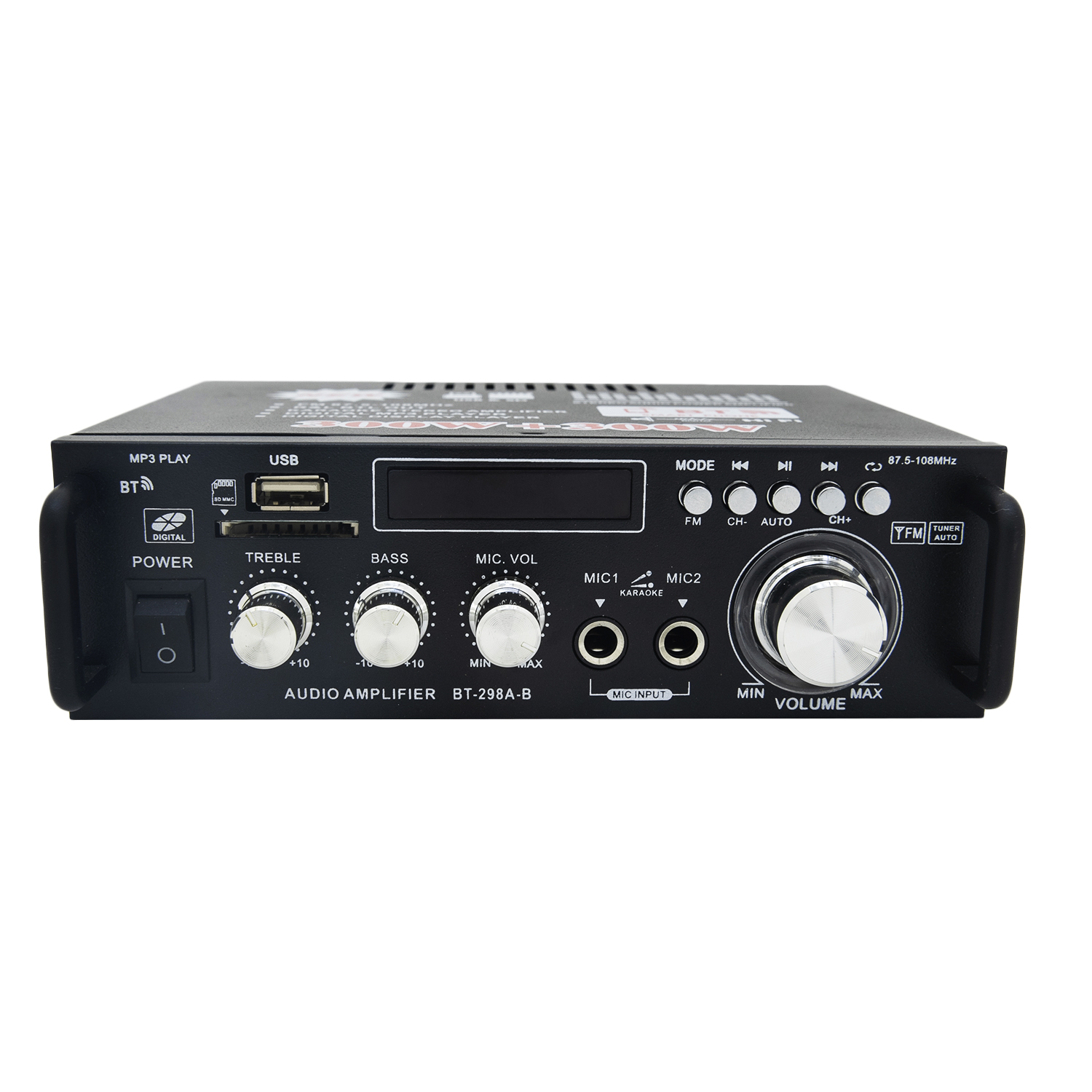 "Аудио Bluetooth усилитель TeLi 2-канальный 300 Вт + 300 Вт для колонок и для наушников изготовлен из железа. Усилитель мощности звука подключается через USB и CD карту, поэтому подойдет для ноутбука, для компьютера, стерео системы. Для беспроводного подключения имеется плата bluetooth. Цифровой двухканальный усилитель для дома с максимальной мощностью 300 Вт и номинальной мощностью 80 Вт обеспечивает качественное звучание на высоких и низких частотах на любой громкости. Получает питание через адаптер на 12 Вольт или от бытовой сети 220 Вольт. Аппарат управляется кнопками и поворотными регуляторами на лицевой панели. Усилитель домашний на ПК оснащен FM радио. "