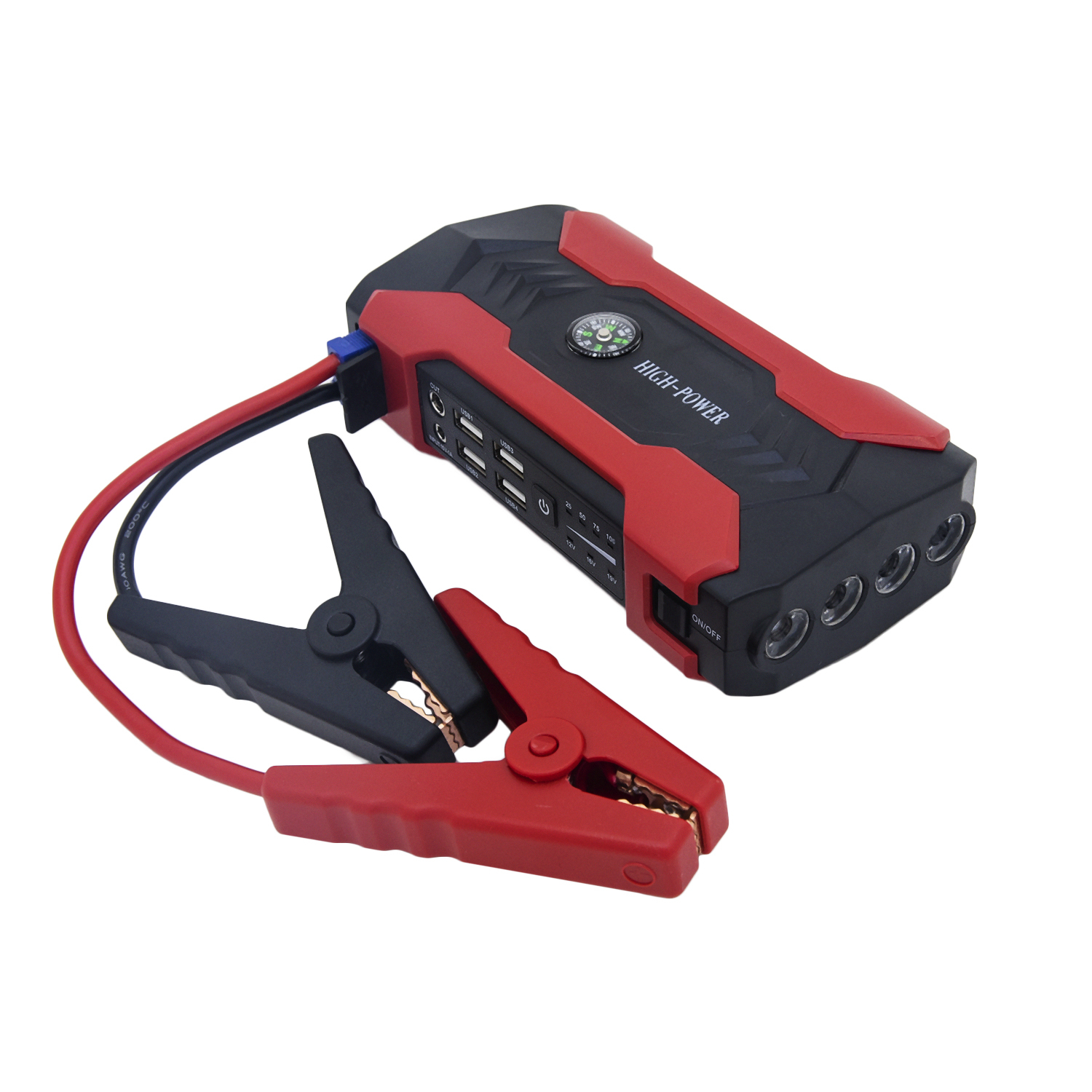 Пусковое зарядное устройство High Power Compas 20000 mAh может использоваться для запуска двигателя автомобиля или мотоцикла при разряженном аккумуляторе, как зарядка для смартфона/ноутбука. С помощью пускового устройство для двигателей автомобиля можно запустить транспортное средство даже в сильный мороз. Пуско зарядное устройство имеет мощный аккумулятор, у которого ёмкость 20000 мАч, при этом его вес не превышает 800 г. На боковой части расположено 4 разъема для зарядки устройств через USB порт. Пусковое устройство с функцией POWERBANK имеет светодиодный встроенный фонарик с хорошей яркостью. В наборе идут пусковое устройство, сетевой адаптер для питания от розетки 220В, универсальный переходник USB с тремя разъемами и кейс для хранения. Запуск автомобиля от пускового устройства производится по инструкции, которая также идет в комплекте.