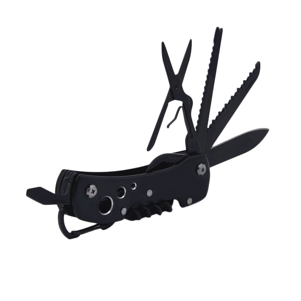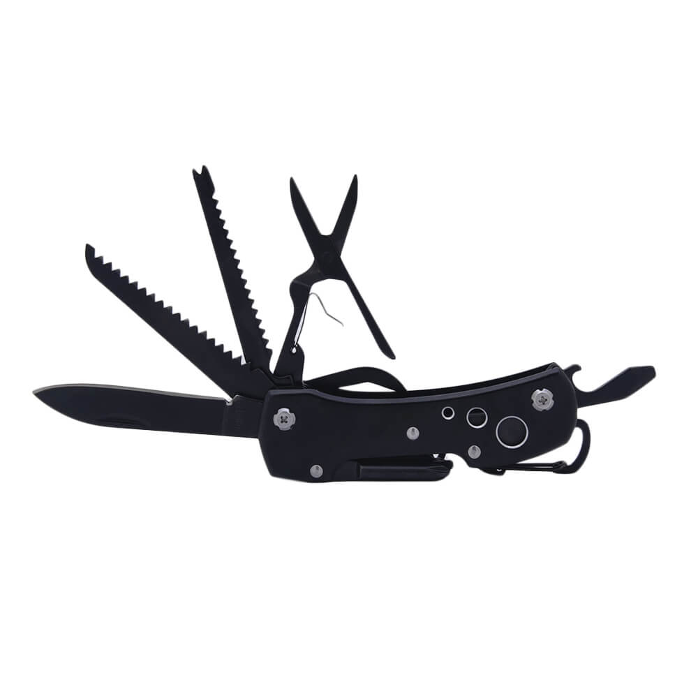 Многофункциональное устройство, включающее в себя двенадцать инструментов для выполнения различных операций. Мультитул содержит два ножа, две пилы с различным зубом, ножницы, отвертку, а также открывашки для консервов и бутылок, есть даже штопор. Приспособление выполнено из высококачественной стали, покрыто воронением. Мультитул компактно складывается и не занимает много места. Корпус устройства оснащен прочным карабином для крепления страховочного шнура.